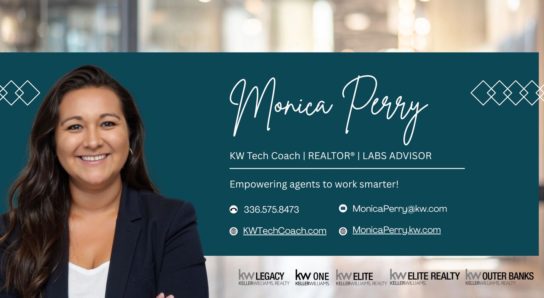 Hi, I'm Monica, your KW Tech Coach. I love KW, Real Estate, TECHNOLOGY and helping YOU become a tech-enabled agent!